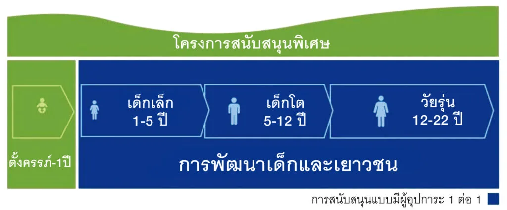 “การพัฒนาเด็กแบบองค์รวมของคอมแพสชั่น” ออกแบบไว้ครอบคลุมตั้งแต่วัยเริ่มต้นของชีวิตไปจนถึงวัยรุ่น ดังภาพนี้